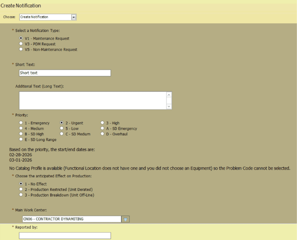When equipment is selected, previously created notifications tied to that asset are displayed to help prevent duplication. Reference data is automatically populated, reducing manual entry while maintaining accuracy.