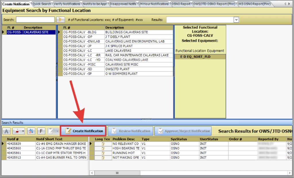 From the Notifications screen, users can search for functional location and equipment, review existing records, and launch the Create Notification workflow directly from the same environment.