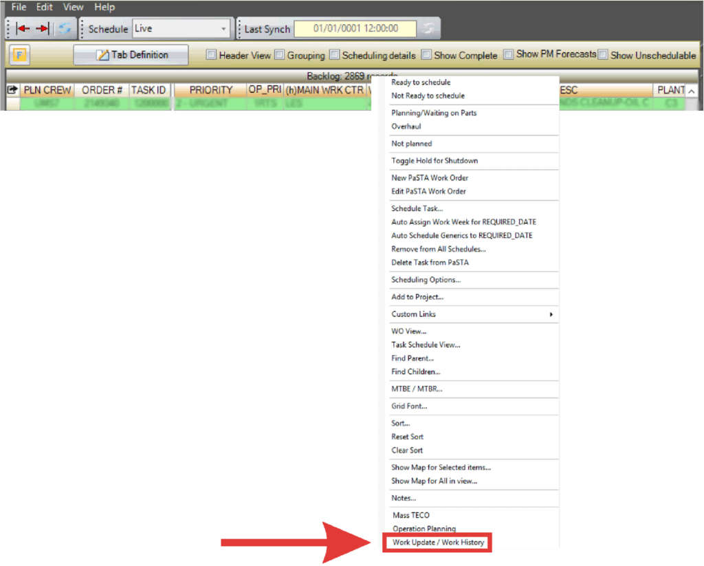 From the WWA grid, users can right-click a work order and launch a guided update interface.