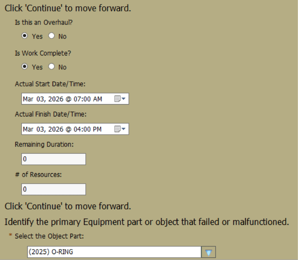 In this example the client implemented a CIC that allows users to update work progress, capture execution details, and record history — all without leaving the Work Week Assignment (WWA) workflow.