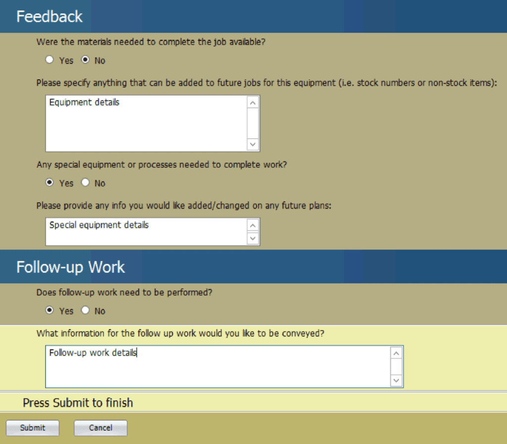 Beyond status updates, the interface supports detailed historical documentation directly tied to the work order, including: