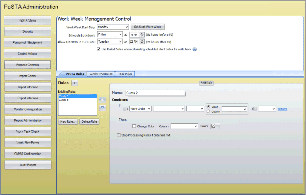 Each part of PaSTA works together to form a coordinated planning and scheduling system. Work orders are imported from the CMMS and assigned to T-weeks in Work Week Assignment. Those planned work orders are then assigned resources for execution in the Work Week Scheduling screen. For more complex work that spans longer timeframes, Projects provide structure and organization. The Reports screen turns data into shareable outputs. Behind it all, the Administration screen and Web Utility Interface ensure that users, resources, and system integrations remain aligned.
