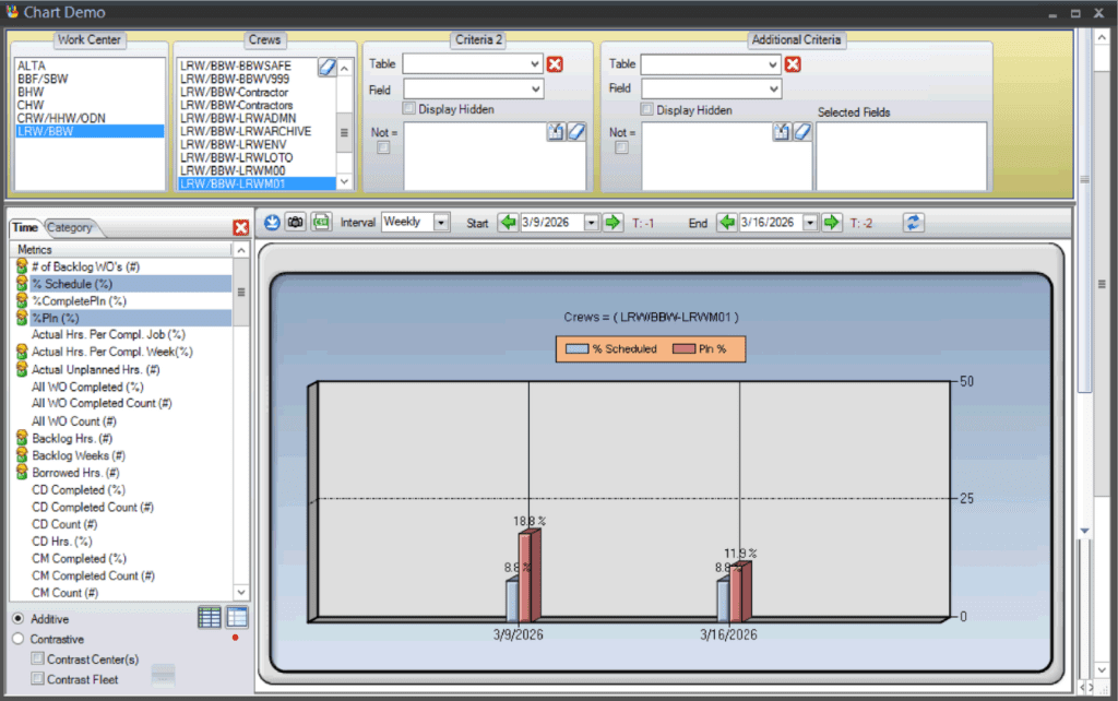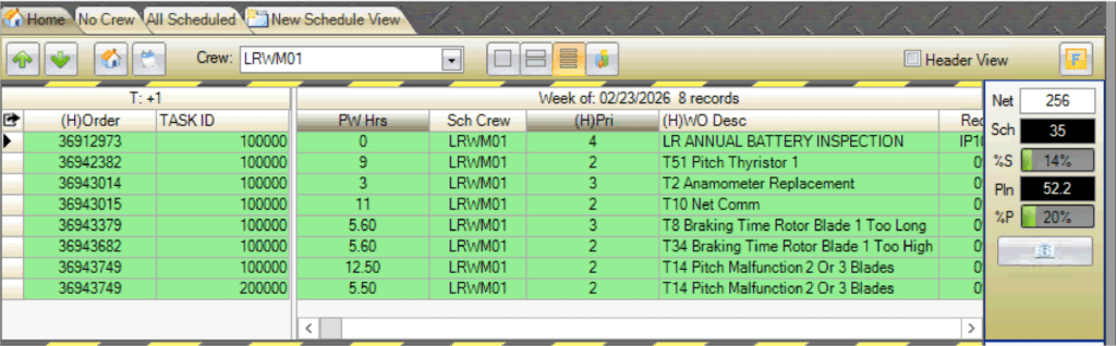 The WWS is where the planned work from the WWA is turned into an executable schedule. From this screen, users assign personnel and equipment to the work orders. They account for unavailable hours, balance workloads against capacity, and track scheduled versus actual hours.