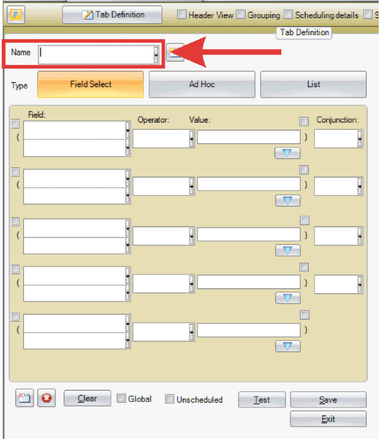 - In the Tab Definition window, type a name for the tab.