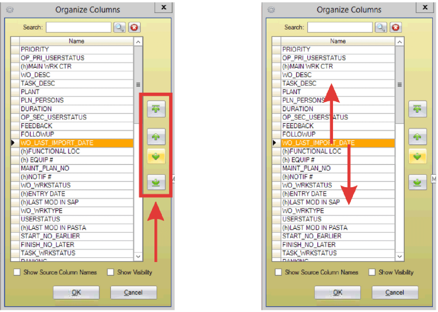 3. Reposition the selected column using the green arrows or by dragging and dropping it to the desired location.