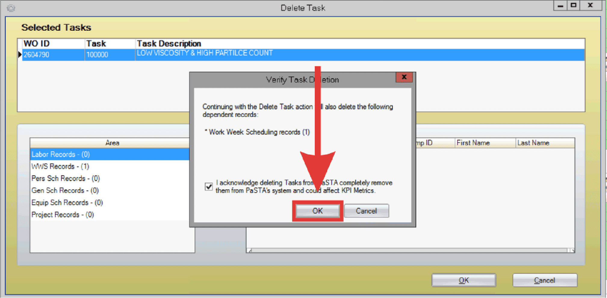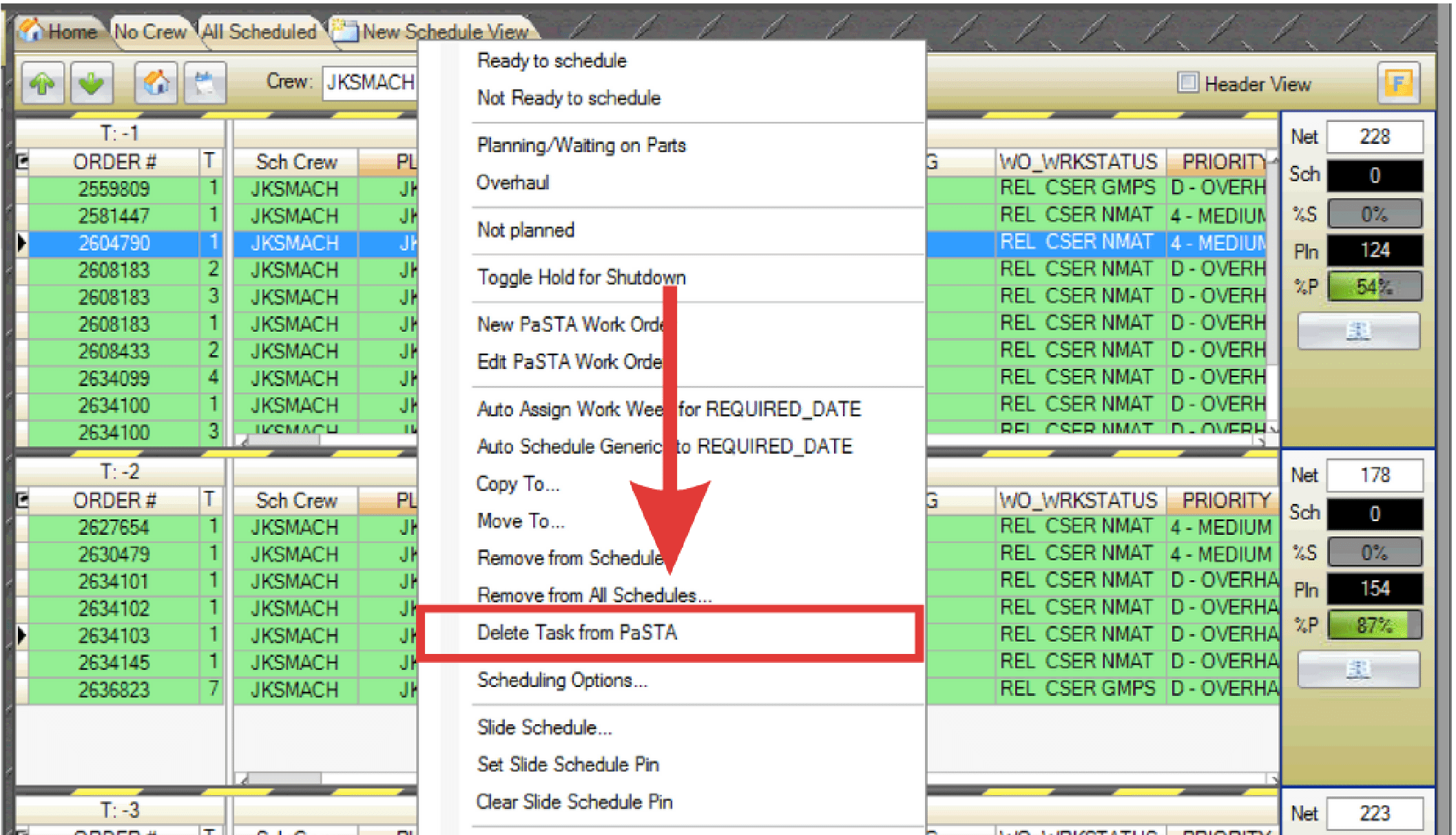 - Right-click the work order to be deleted and select Delete Task from PaSTA.
