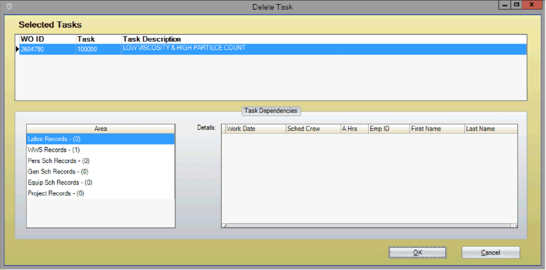 - In the Delete Task window, verify the correct task is selected. Select the area where the task should be removed. The number shown in parentheses represents how many times that task appears in that area. Click OK.