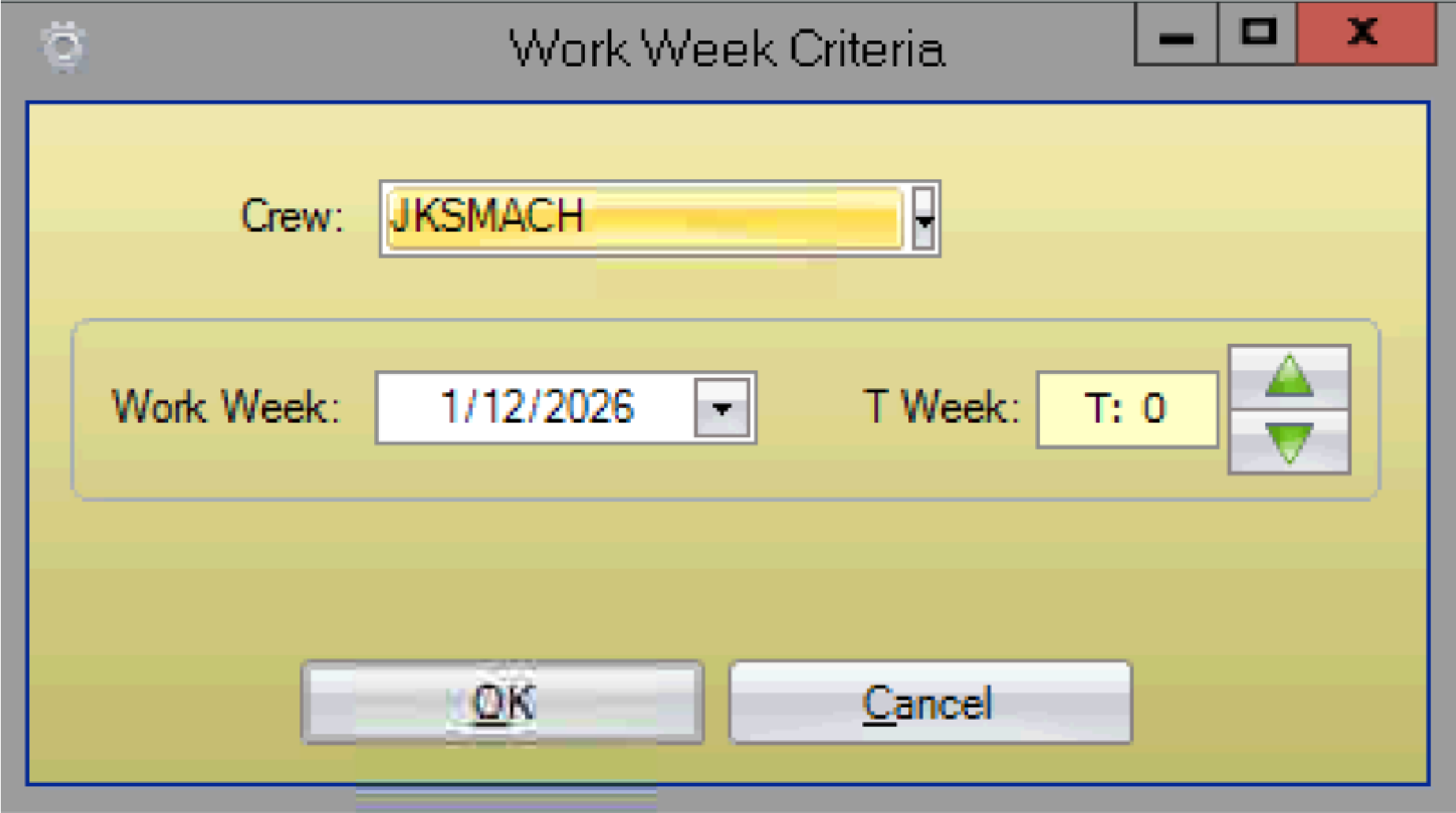 - In the Work Week Criteria window, validate the crew, select the applicable T-week using the work week calendar or green T-week arrows, and click OK.
