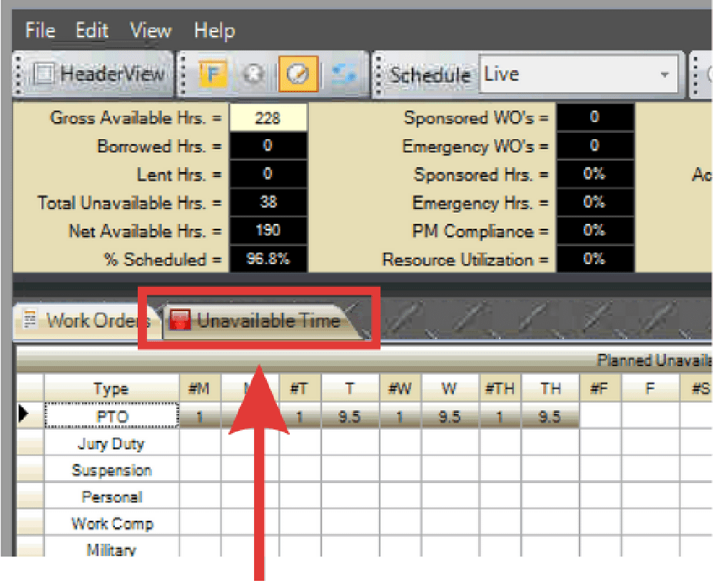 - Planned Unavailable Time Grid: Used only during T- Work Weeks to identify planned time such as Vacation, Sick leave, Training, etc. that will not be available to do maintenance work during that particular work week.