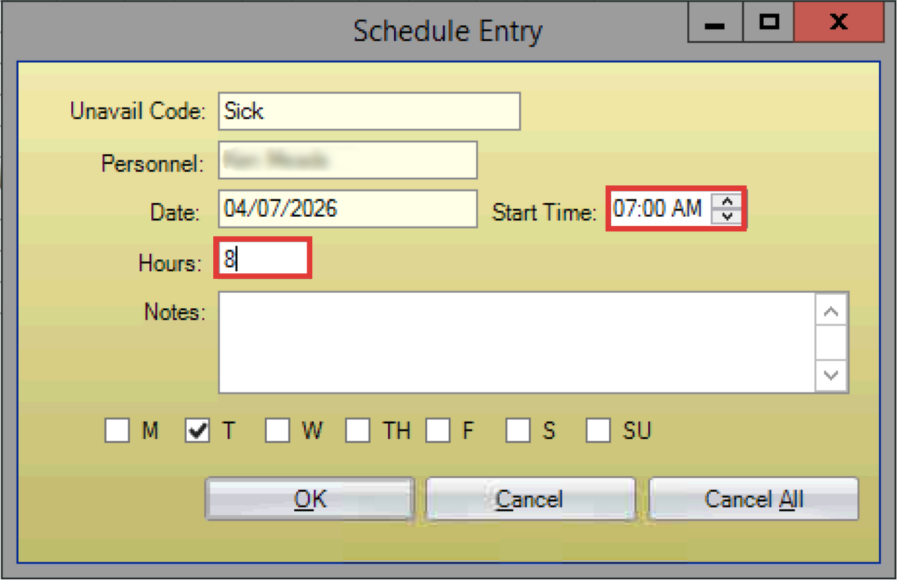 - The Schedule Entry dialog box opens. Select the start time and enter the number of hours the person will be unavailable each day.