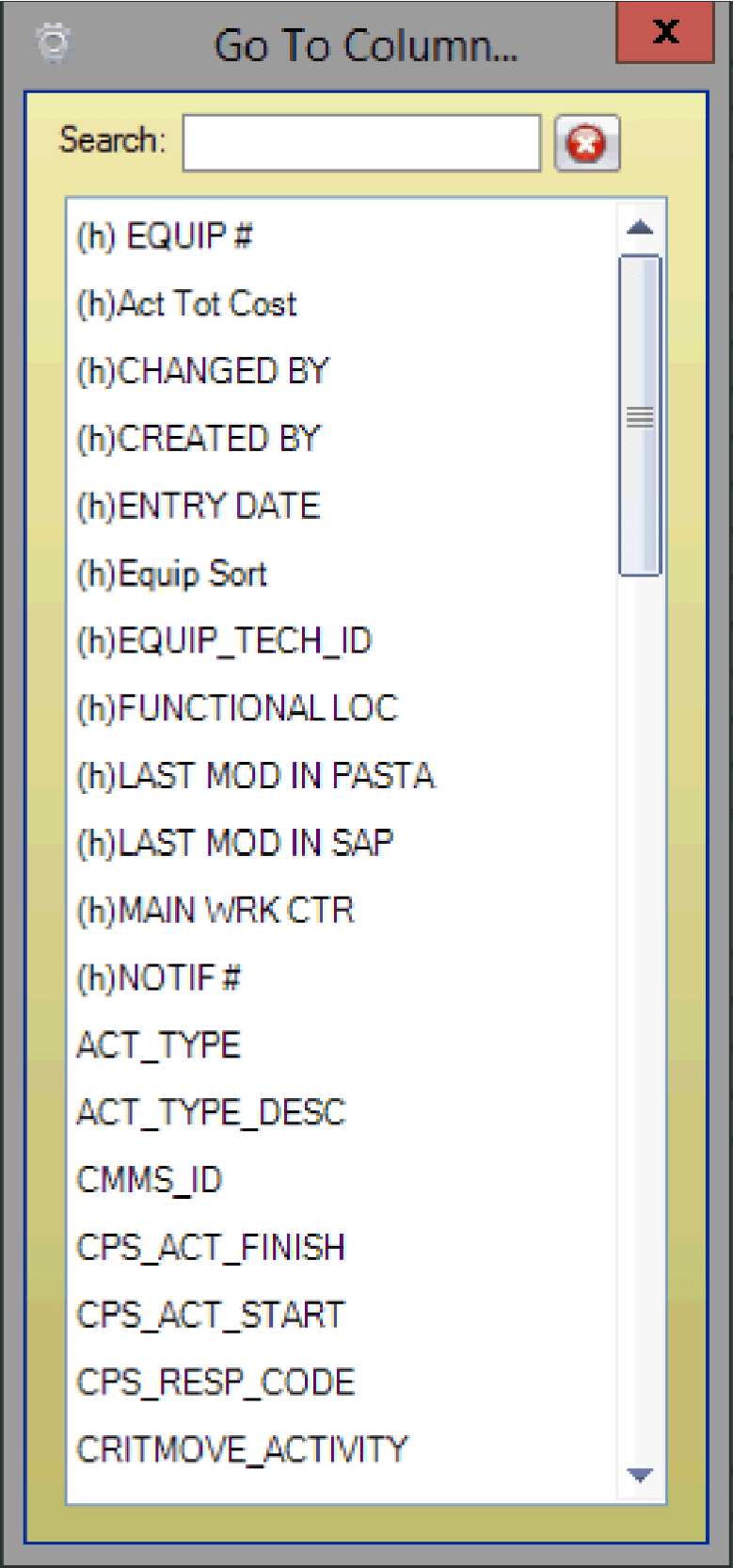 - The Go To Column window opens. Scroll to select a column or use the search field to locate it.